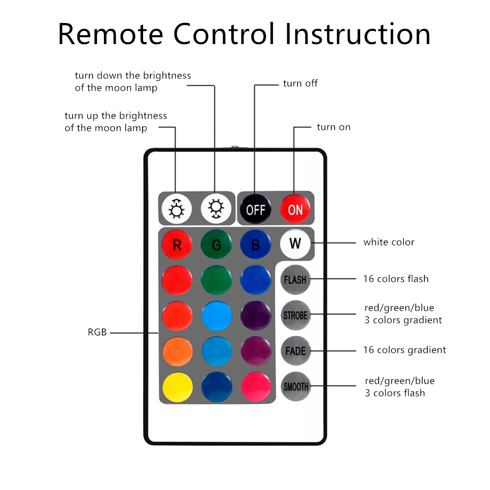 Rechargeable battery and USB charging (include cable without Adapter). From 2 colors to 16 colors tap touch or remote controller available, you can switch any color by tapping on the moon lamp.