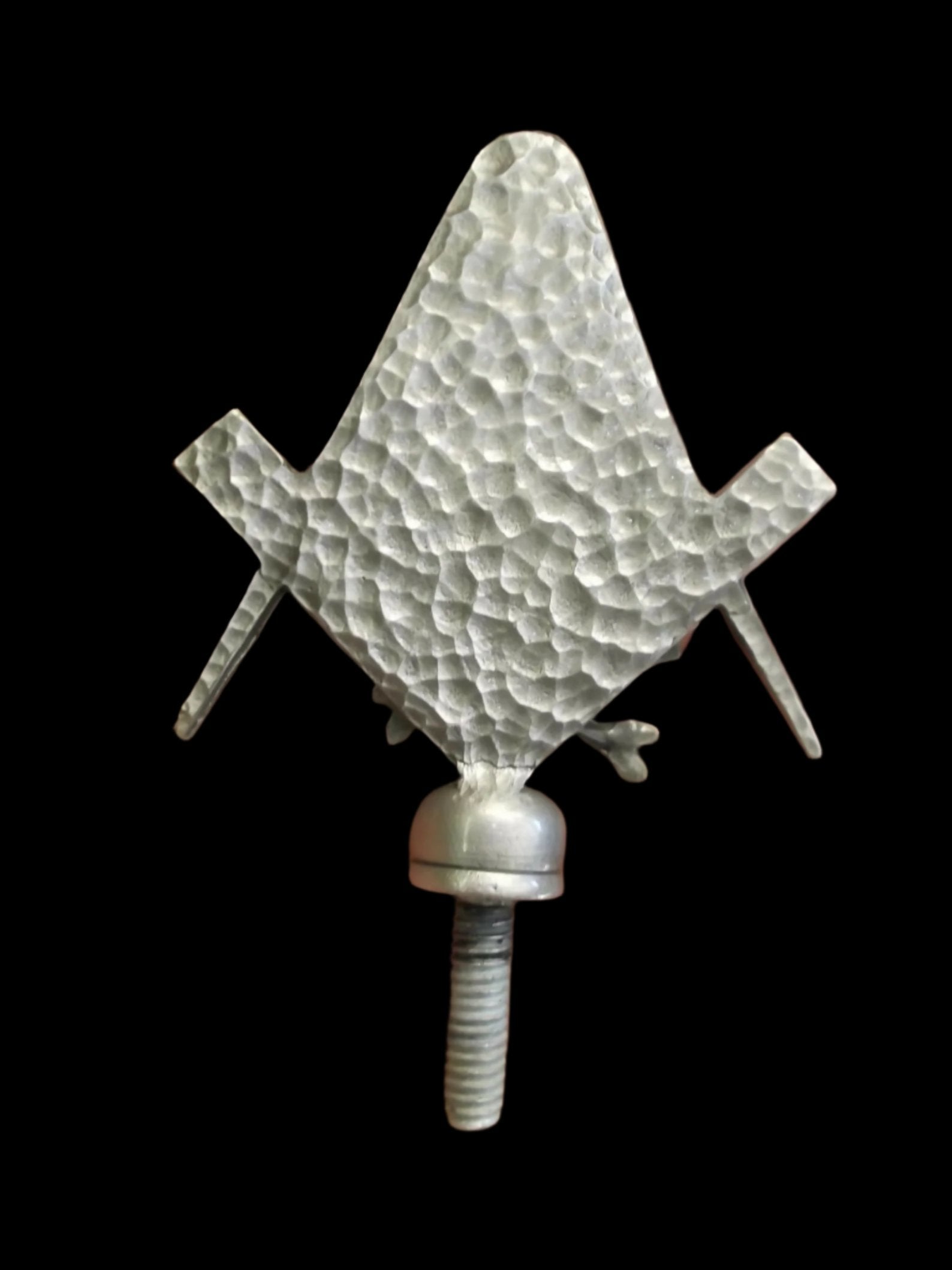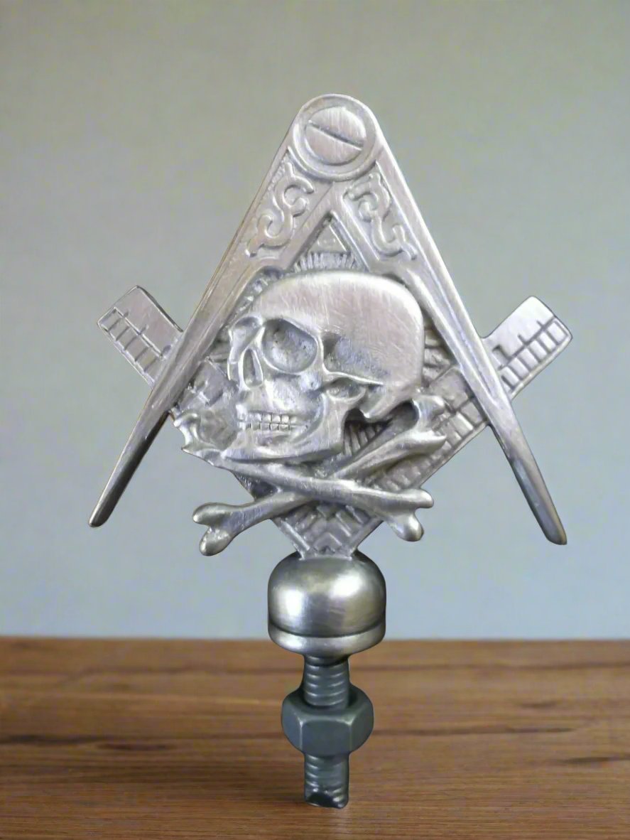 Elevate your Masonic collection with this exquisite Widows Sons Hood Ornament, a truly original design in premium lead-free pewter. It showcases a skull and crossed bones, framed by the iconic square and compass. The ornament boasts a striking blackened, brushed, and lacquered finish, offering elegance and durability. Standing an impressive 3" tall, each piece is meticulously hand-cast and finished to order, guaranteeing unparalleled craftsmanship.